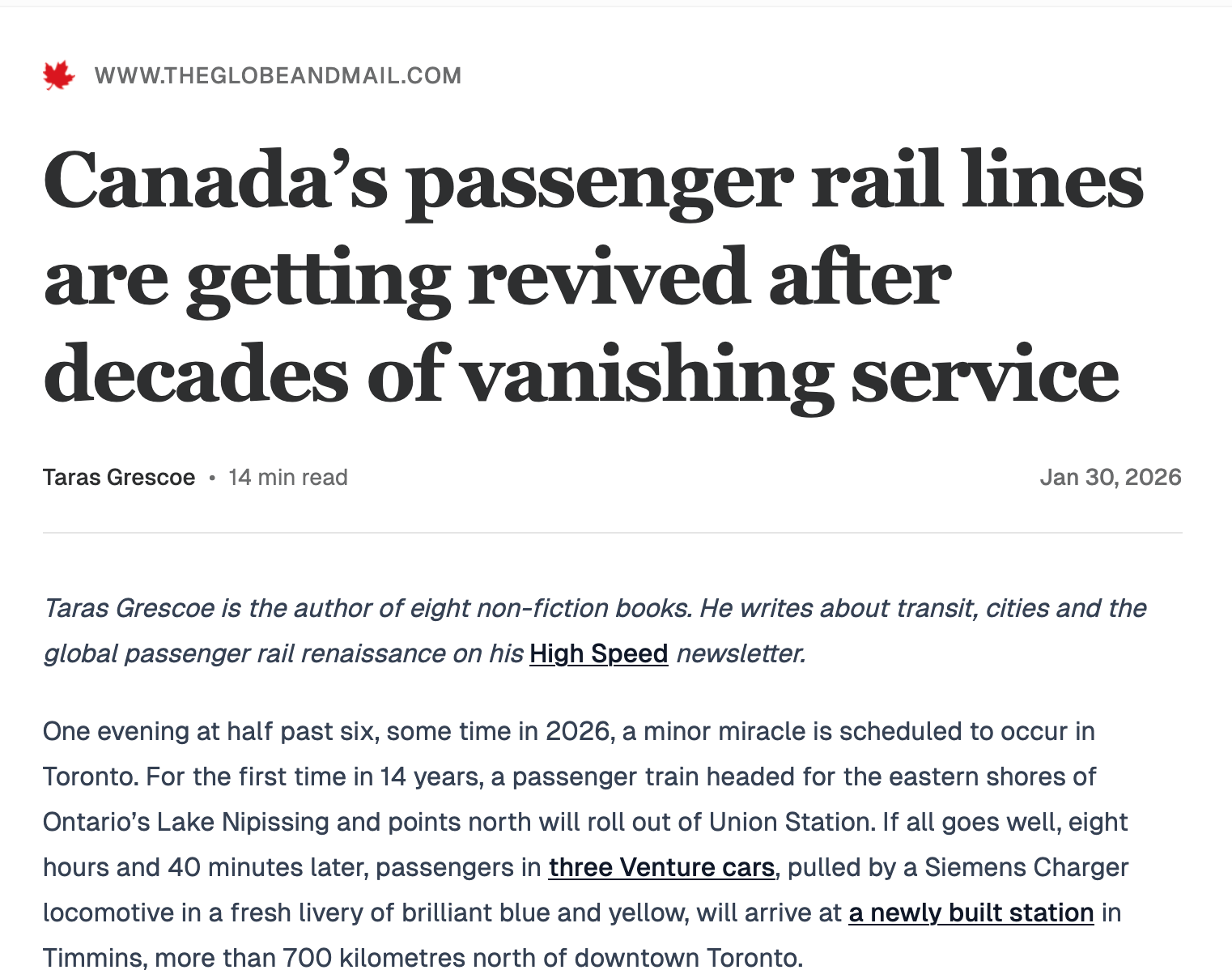 Back on Track: My Globe and Mail opinion essay on the passenger rail revival in North America, with focus on return of Ontario Northland train service in 2026. (Here's the link.)